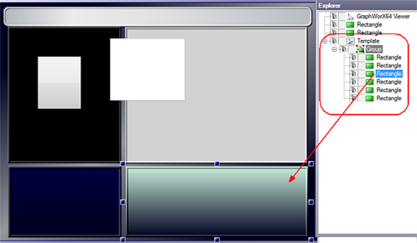 You can create templates for regular monitor displays and Windows Phone displays. Anything you can create in a GraphWorX64 display can be saved as a template file. When applying a template, all template elements are used in a single layer behind all the objects on the display. You cannot modify template elements unless you are in the Closedtemplate group object in the Explorer pane. If the template is saved with more than one layer of objects, then the template is applied with all of those objects combined into the template layer.