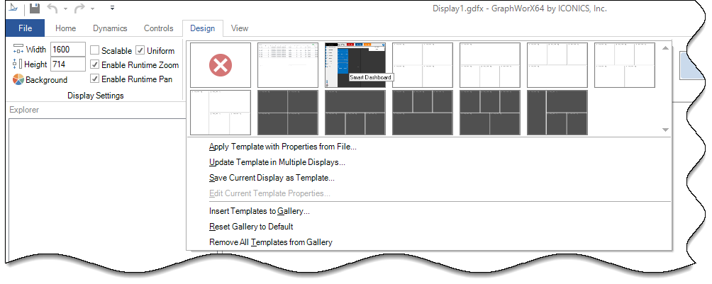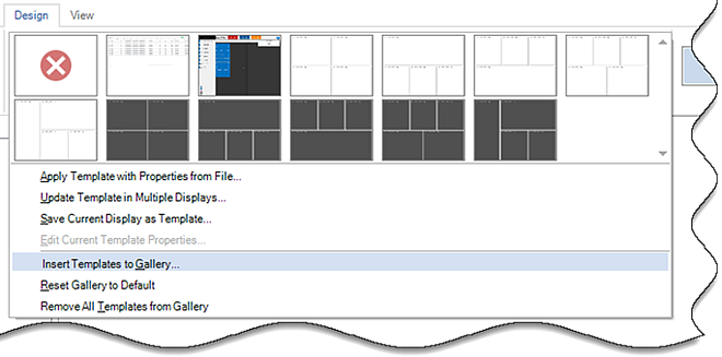 To create a new display using a starter display, open GraphWorX64, go to the Design ribbon, and select one of the displays in the Templates gallery.