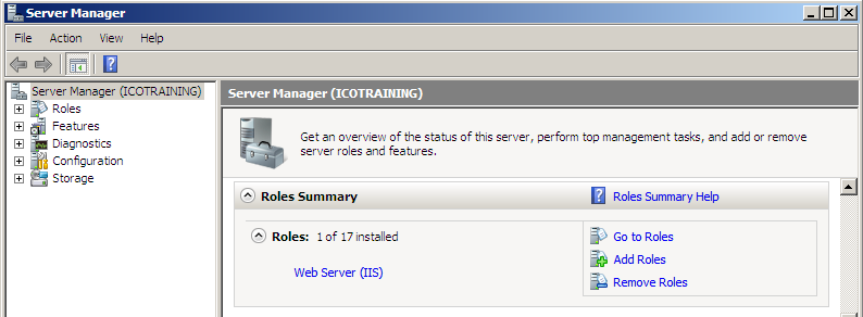 In the Server Manager MMC that comes up, scroll down to find Roles Summary to check that you have the Web Server (IIS) role listed.