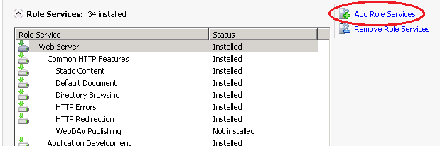 Scroll down to find the Role Services Section and make sure WebDAV Publishing is installed. If not, select Add Role Services, then select WebDAV Publishing and hit Next, then Install.