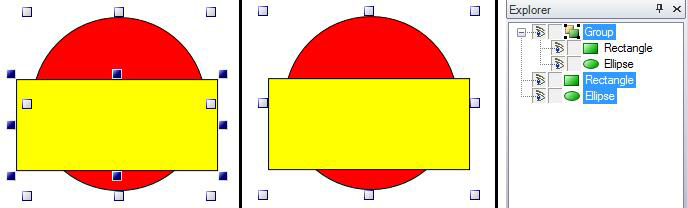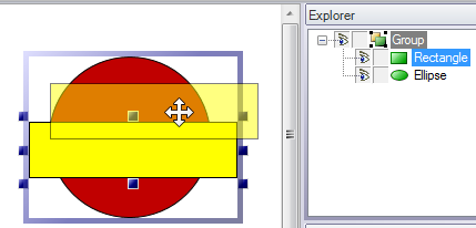 In the figure above, the Rectangle is in front of the circle and is selected; the red circle behind the yellow rectangle on the left is selected, but is not the primary object. When you select a group object on the design surface or the group object in the Explorer tree, that object is selected as a single object and is manipulated as a single object. You can move the group as a single object, reassign its top-to-bottom order by dragging the group object up or down in the Explorer, and so forth.