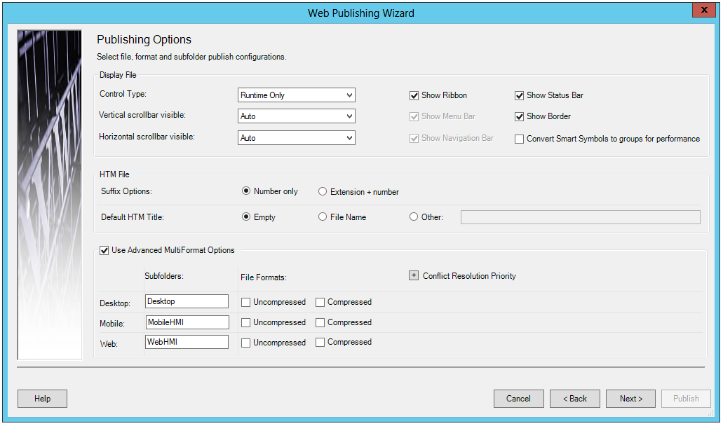 You have the option to publish in multiple formats. You can check the Use Advanced MultiFormat Options checkbox if you intend to publish files in anything other than a standard Desktop format.