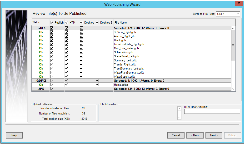 - If you selected 'Next' from the previous step, you will then see the Review File(s) To Be Published section of the Web Publishing Wizard. Your selected file(s) will appear, where you will see the status of each file, along with any Warnings, if applicable. For each file, you will have the option of setting, via checkbox, whether to Publish that file and/or create an HTM (Web) version of the file and/or create a standard Desktop version of the file and/or create a compressed Desktop Z version of the file. On the top of each file type column (e.g. 'Publish, HTM, Desktop, Desktop Z), you can also choose to check all or uncheck all. The Scroll to File Type pulldown, located in the top right of the window, allows you to scroll directly to a given file type such as .GDFX, .GDFXZ, .JPG, etc.