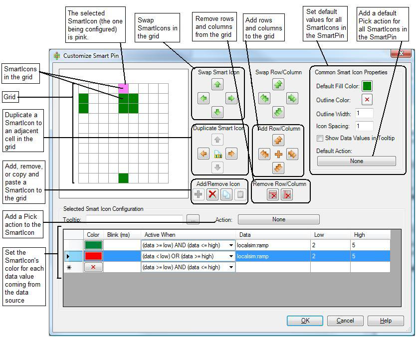 If there are default values or common properties that you want to set up for all of the SmartIcons in the grid, enter them now using the Common SmartIcon Properties section at the upper right of the SmartPin editor. Note that you can override these values for each SmartIcon.