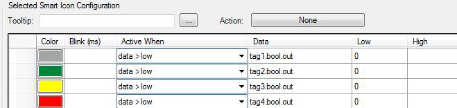 You will need to assign multiple data sources to a SmartIcon if the icon is monitoring a device that provides each state as a separate boolean (bit) tag. If you do this, the sequence in which you list the data sources in the Selected SmartIcon Configuration table determines which color state displays for the SmartIcon.