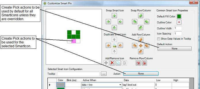 If runtime operators need to be able to take action based on a SmartIcon's status, you can assign Pick actions to each SmartIcon. The Pick actions can be different for each SmartIcon, but you can set up a default Pick action for the entire SmartPin that you override for individual SmartIcons if you need to. These instructions describe how to create a Pick action for an individual SmartIcon, but the steps to create a default Pick action for all SmartIcons in the SmartPin except that you click the Default Action button in the Common SmartIcon Properties section of the dialog box.