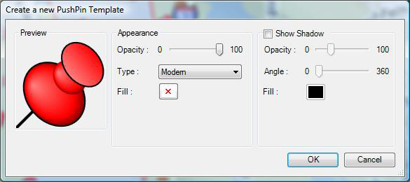 Design the PushPin you desire. You can configure the PushPin's appearance (specify its opacity, type, and color or fill). Optionally, you can configure its shadow (put a checkmark in the Show Shadow check box and then specify the shadow's appearance). Click OK when you are done.