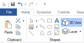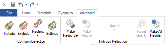 The 3D environment has its own File menu, and a ribbon with the following tabs: Home, Materials, Dynamics, and Advanced. Double-clicking on a ribbon tab opens and closes the ribbon bar.