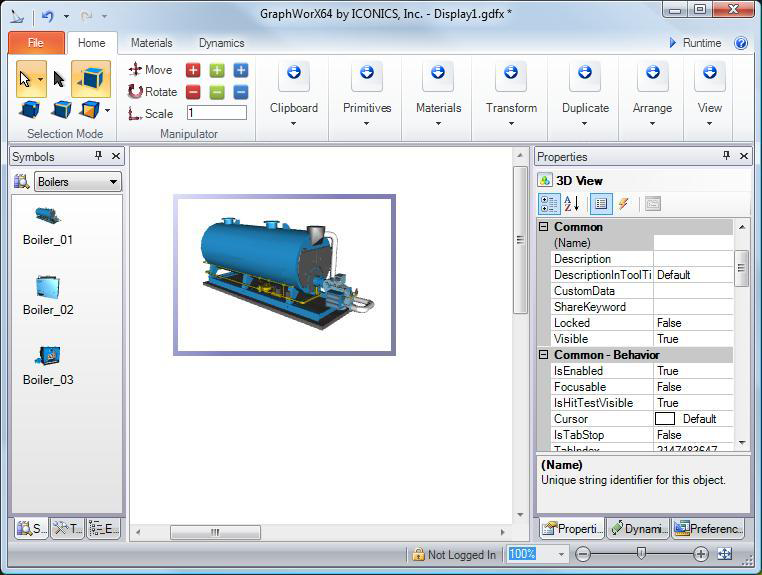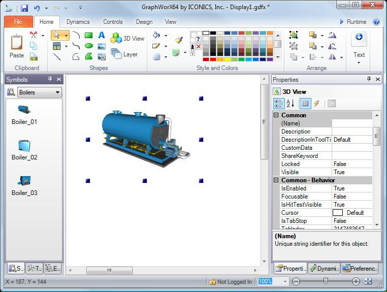 draw a 3D view inside an active viewport. The GraphWorX64 ribbon switches to the 3D ribbon. You can now add 3D objects and configure them using the features on the 3D tabs.