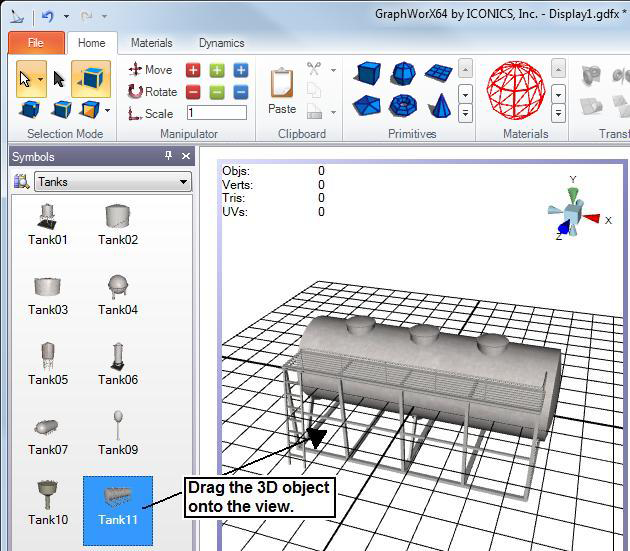 To add a 3D object or symbol to a GraphWorX64 display: