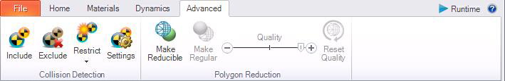 On the Advanced tab of the Workbench64 ribbon, you have access to collision detection and polygon reduction.