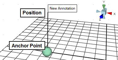 Position identifies the coordinates (in X,Y,Z format, where X, Y, and Z are the axes) of the annotation box, as shown in the illustration below. To change the coordinates, select the annotation in the Explorer and then move it using the Move manipulator.