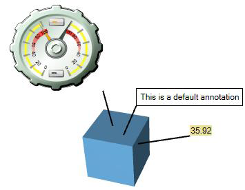Annotations are 3D graphic labels that remain in place when a 3D display or an object rotates or moves in a 3D view. An annotation is anchored to the object that it labels. The label can contain an object's description or can display a digital readout. For example, you can use a gauge from the Symbols Library in an annotation of an animated tank object, which the gauge monitors; runtime users can rotate the animated tank, but the gauge always faces runtime users so that it can always be read.