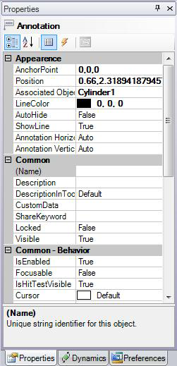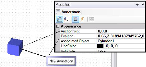 AnchorPoint identifies the coordinates (in X,Y,Z format, where X, Y, and Z are the axes) on the object where the line is anchored in configuration mode (see the illustration of the AnchorPoint and Position properties below). Note that these coordinates are in relation to the associated object, not in relation to the 3D view's grid. For example, 0,0,0 places the anchor point in the center of the object. If the ShowLine property is True, this is the coordinate on the object where the line connects to the annotation. To change the AnchorPoint's coordinates, refer to Moving an Annotation or Its Line.