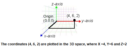 The point on each axis is represented by a number, and the point in space is expressed as the three axis numbers in XYZ sequence. This gives the 3D coordinates of a point in space. The point of origin is always expressed as(0, 0, 0). Where the three axis coordinates intersect, we have the coordinates in the 3D space.