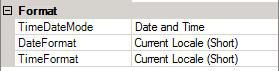 TimeDateMode property to either: Time Only, Date Only, Time and Date, or Date and Time. You can type any character in the Separator property to separate the time and date. -