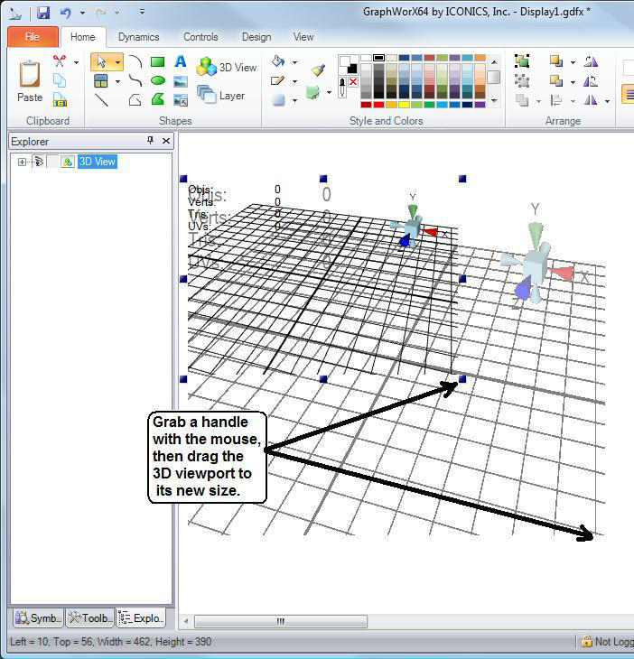 You can get a better idea of the size of a GraphWorX64 workspace and the 3D views inside it by using the