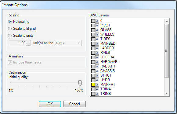 The DWG Layers menu allows you to select which layers you wish to be included in the import. By default, all layers are included.