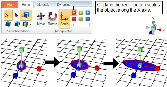 Using toolbar buttons: Alternatively, you can click the red, green, and blue + and - manipulator buttons to incrementally resize the object or sub-element. See Move, Rotate, or Scale Objects Incrementally Along an Axis below for details. For an example of how these buttons help you scale an object,