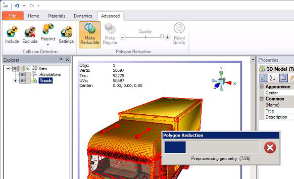 You can stop here if you like. Taking no additional steps gives you the ability to undo your polygon reduction at any time by clicking the Reset Quality button on the ribbon's Advanced tab. Stopping here improves rendering performance at runtime but because the model's detail are all still stored with the display you will not improve the display's loading performance.