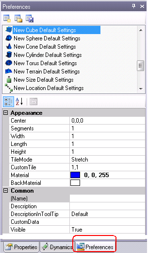 Preference tab lists the objects you can set default values for, and includes general settings, grid settings, 2D shapes, groupings, 3D primitives, and dynamics. For a list of the preferences available to you, refer to Preferences.
