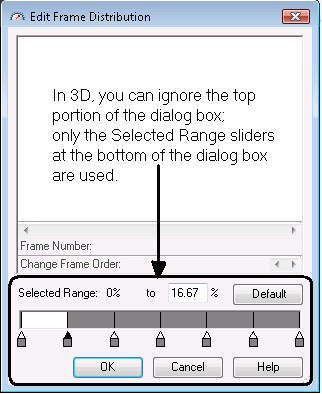 Edit Frame Distribution dialog box. In 3D you can use the Selected Range sliders at the bottom of the dialog, just as you do when working in 2D. But in 3D, you don’t use this dialog box to change the sequence of objects in the frames.