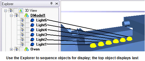 Select the six spheres, then click the Range icon in the of the Dynamics ribbon. This groups the six spheres into a dynamic model called DModeln in the Explorer and adds a Range Selector dynamic for the Dmodel group;