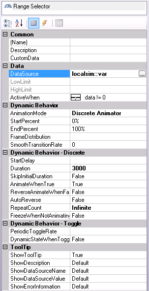 Use the PeriodicToggleRate property to start and stop the animation. By default, once the animation begins it will run as long as the Range Selector dynamic’s ActiveWhen property tells it to. However, you can use the PeriodicToggleRate property to toggle the animation off and on by specifying a number of milliseconds or by choosing a data source that will turn it off and on. For example, if you enter 5000 milliseconds, the animation will run for 5 seconds, then stop for 5 seconds, then run for 5 seconds, and so on. Or you can specify a data source that will stop and start the animation.