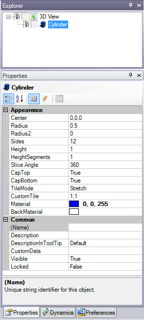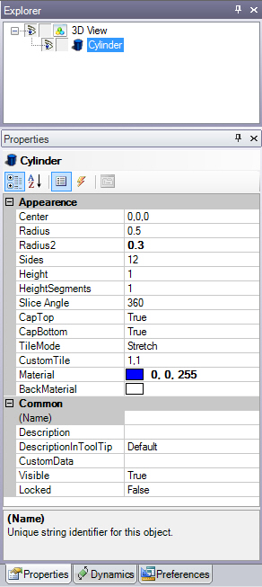 Use the cylinder's properties to make other changes to the cylinder. Many of the cylinder's properties are described in Common Properties for All 3D Primitives.