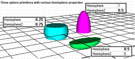 Use the sphere's properties to make other changes to the sphere. Many of the sphere's properties are described in Common Properties for All 3D Primitives. A sphere has properties called Hemisphere and Hemisphere2 which define the two hemispheres of the sphere. Use these properties to truncate a sphere. The range for each