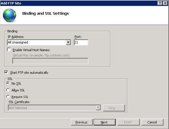 For the Binding and SSL settings, leave the IP address as “All Unassigned” and the port to 21. Check “Start FTP Site Automatically”, and set it to “No SSL”. Click Next.