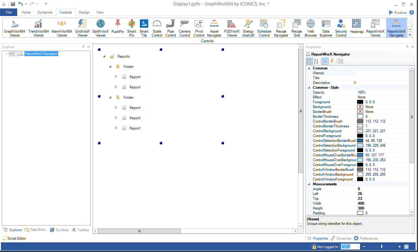3. After setting the Object Properties, the ReportWorX Navigator control can be saved when the containing GraphWorX64 display itself is saved.