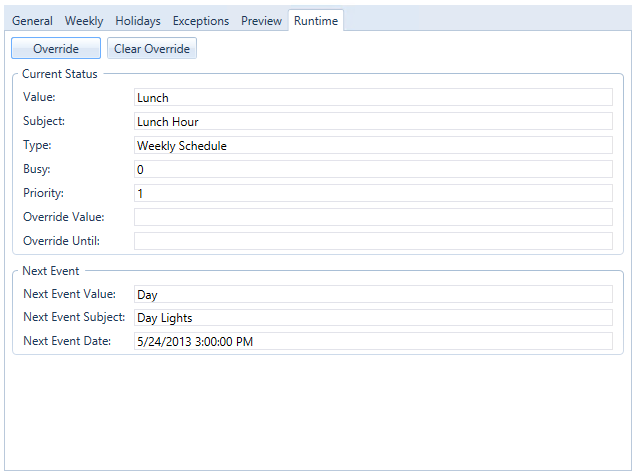 The Runtime Tab of the Schedule Control (from a ScheduleWorX View configuration) Runtime (Calendar View) properties allows you to override the existing schedule or clear a set override. It also provides the Current Status of the schedule as well as lists information regarding the schedule Next Event.