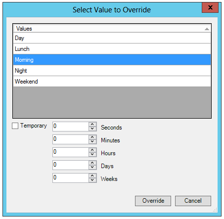 Override - Clicking this button opens the 'Select Value to Override' dialog, shown below. The Values section is populated by the ValueSet Values attributed to the Data source you selected when configuring the ScheduleWorX View or BACnet Schedule View. Clicking the 'Temporary' checkbox sets a limited time for the override to take effect (in Seconds/Minutes/Hours/Days/Weeks). Click the 'Override' button in the bottom right corner to proceed.