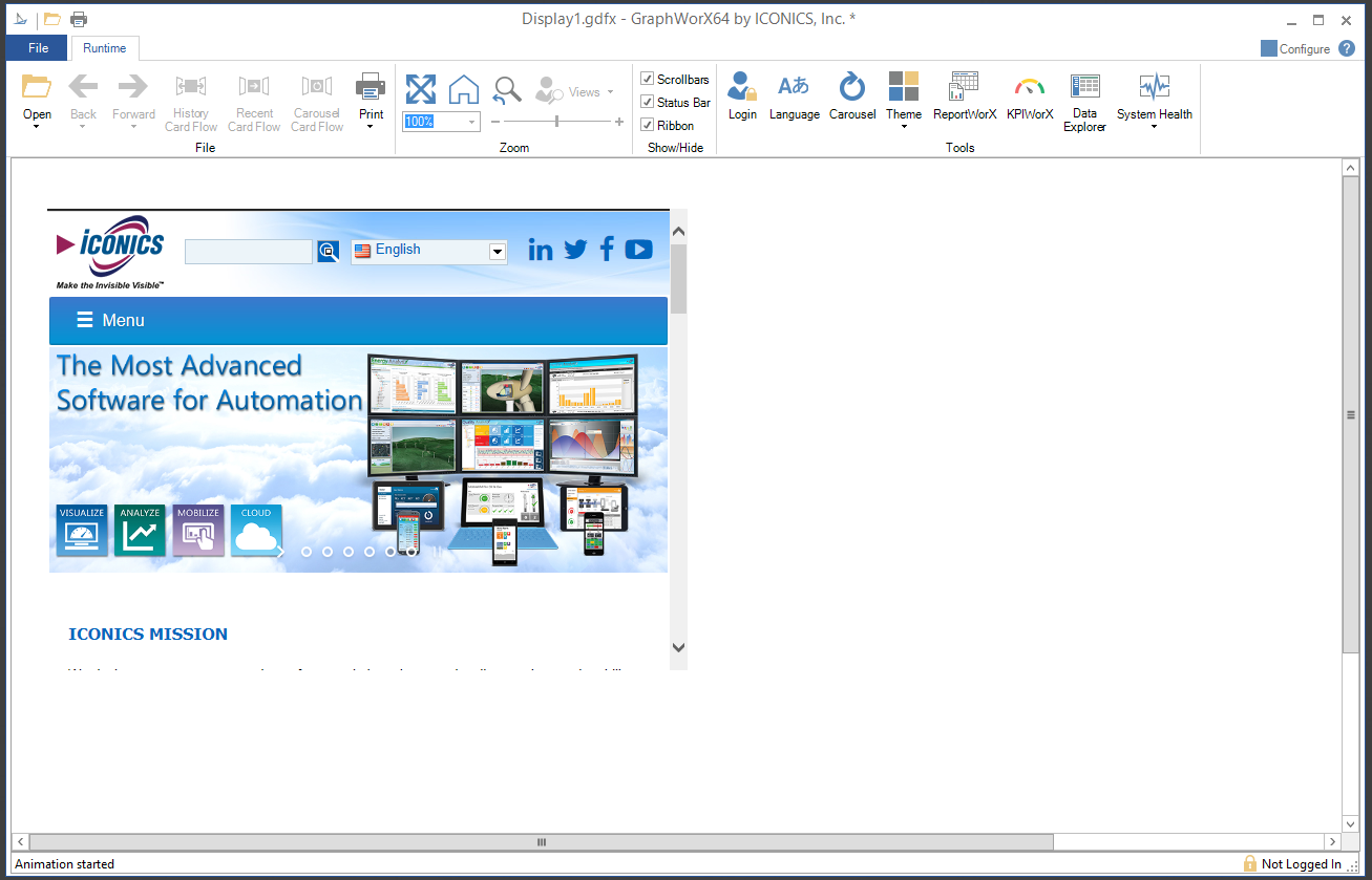 Putting a GraphWorX64 display containing a Web Browser control into Runtime mode switches out the placeholder icon with the loaded Web site or data source. In the image below, the Source property had been set in Configure mode as https://www.iconics.com.