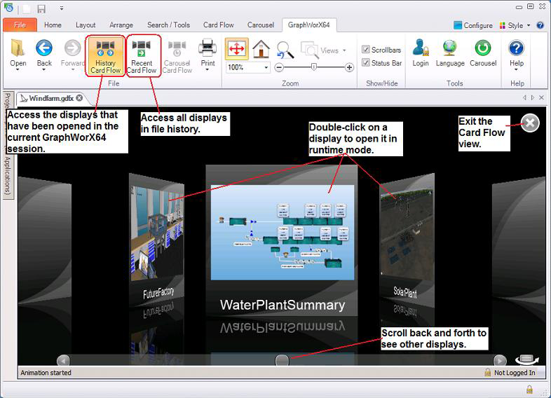 In GraphWorX, the Card Flow view (shown below) is a tool you can use in runtime to preview other displays in file history before opening one. This is a handy alternative to the Back and Forward buttons, which provide lists of files in file history but no ability to preview the files you're about to open.