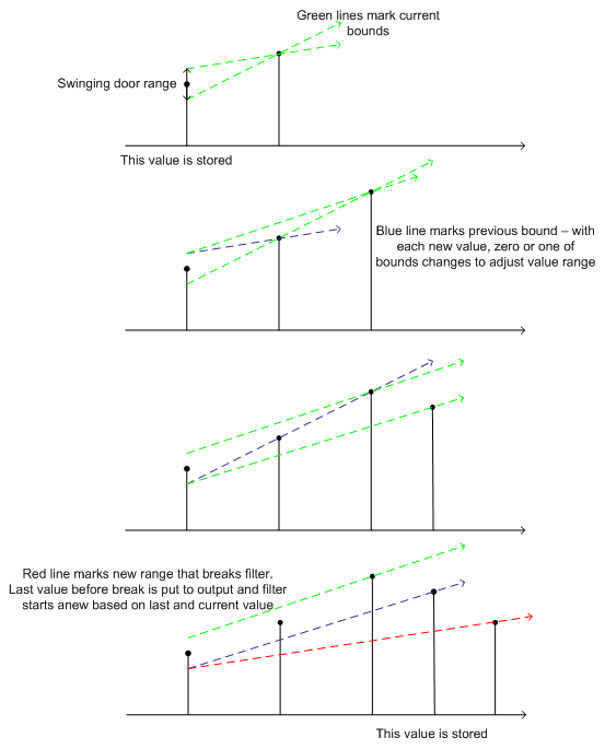 Swinging door is a generalization of a deadband filter. Swinging door filters off values following certain linear trend. It starts with one value (the first one is always forwarded to storage). Two tangents are considered, originating above and below base value in defined filter range. Tangents are effectively defined by second value in filter (see example). As subsequent values come in, tangents are adjusted to form geometrical region encompassing all values in filter so far.