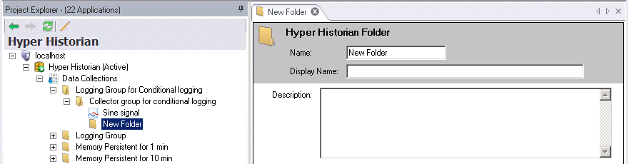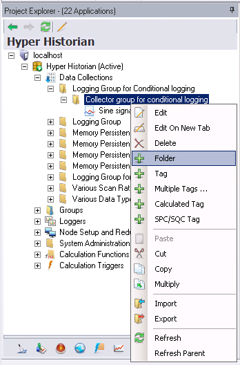 You can now add Hyper Historian Tags to the Collector Group or create Hyper Historian Folders to which you can then add Hyper Historian tags (within the Data Collections node). Steps for creating tags and folders are provided below in this topic.