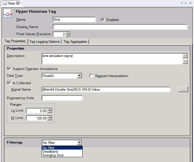 Note: Filtering options are not available if the Is Collected check box is empty. A tag's Filtering option is applied to data in the collector. If the tag's data is written directly to the logger, no filtering can be applied because the data never passes through the collector.