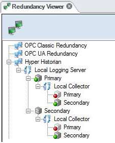 In the GENESIS64 Workbench, use the Redundancy Viewer (shown below) to see the status of your local logging server and its collectors. To see the viewer, from the File menu, select Tools > Redundancy.