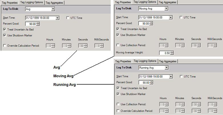 If you don’t want to filter samples before they are sent to the logger, select the All Samples option. As a result, all collected values are forwarded to the Logger. But if you do want to send calculated values (before the Deadband and/or Swinging Door filters are applied), select one of the options offered in the Log to Disk pull-down list: