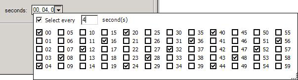 - Pick Specific Times: Put a checkmark in this box if you want to pick the second at which logging is to occur each minute, or the minute and second at which logging is to occur each hour, or the hour/minute/second logging is to occur each day that logging takes place. Then chose the hour, minute, and/or second at which logging is to take place by clicking the drop-down box and choosing an option, as shown below. You can choose individual intervals, or put a checkmark in the Select Every checkbox and specify an interval, as you can see in the following example.