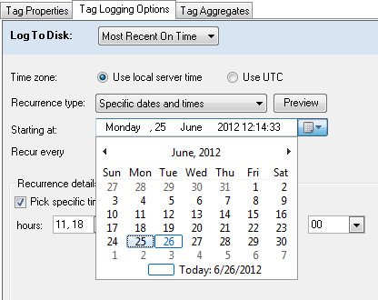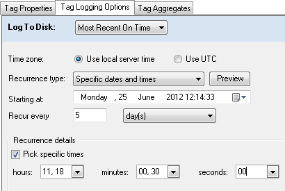 You can choose to log the most recent data value at a certain time interval or at specific dates and times. If you choose this second option under Recurrence type, the dialog changes slightly. In particular, the Recurrence details area will display options relevant to the unit of time that you select in the Recur every option. In the example below, the logger will log data at 11:00:00 AM, 11:30:00 AM, 6:00:00 PM, and 6:30:00 PM (local server time) every fifth day, starting at 12:14:33 PM (local server time) on Monday, June 25, 2012.
