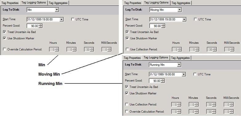 Moving Min ‡ (moving minimum) – The calculation period moves forward each time a value is collected, creating a sliding window of time from which the lowest value is determined. The lowest value collected during the sliding calculation period is sent to the logger.