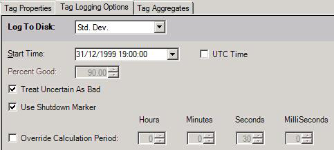 This option logs the standard deviation value of all samples collected for the tag. It calculates the standard deviation value over the specified calculation period if there is a check mark in the Override Calculation Period check box. If the Override Calculation Period check box is empty, the standard deviation value for all samples ever collected is logged each time a value is collected. Settings for this filter are described in the Settings for Each Log to Disk Filter Option section at the end of this topic.