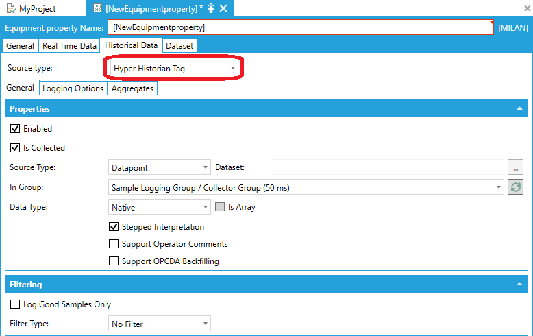 Hyper Historian is only able to log the source of Equipment Properties that have the Source type set to Dynamic tag.