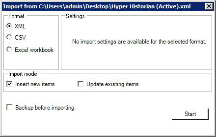 Choose the Format of the file you are importing into Hyper Historian. You can choose an .xml file, a .csv file, or an .xlsx (Excel Workbook) file.