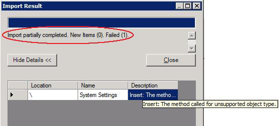 A dialog box tells you the import's progress and gives you a message when the import is complete. Below are examples of a two imports: one that was successful, and another in which the user tried to import a file of System Setting into an incompatible file of Hyper Historian tags.