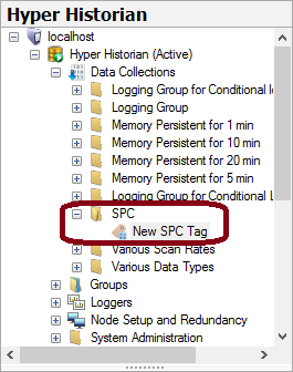 In Hyper Historian, expand the Data Collections folder and create a new folder called SPC. Once you have created this folder, right-click on it and select the + SPC Tag option to create a new SPC tag. The SPC Tag Configuration Dialog appears, and the project explorer contains the SPC folder and your new tag, as shown below: