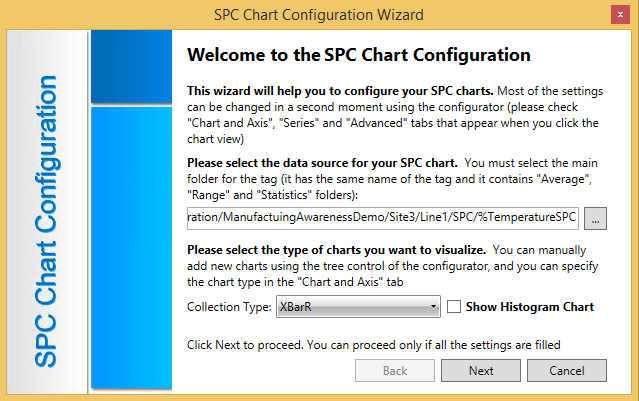 NOTE: Three charts will be created � SpcPrimary showing Average, SpcSecondary showing Range and Statistics with Histogram Chart (Data source path of each chart is automatically adjusted to point to proper data).